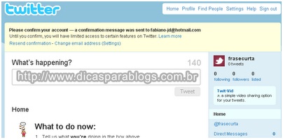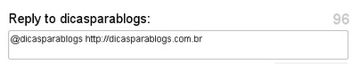Essa foi a parte de criação do seu perfil no Twitter, agora é só voltar a pagina principal, encontrar seus amigos ou fazer novos e usar essa rede social, lembrando que as mensagens que envia não poderão passar de 140 caracteres. Se quiser enviar uma mensagem direta para alguma pessoa na tela inicial escreva @nome e dar um espaço, claro que usando o nome que está no perfil de quem você quer falar. Verá que o titulo muda automaticamente para reply to...