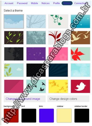 Settings: aqui fazemos as configurações e alterações de template no Twitter, que é um pouco limitado, apenas podemos mudar as cores ou imagens de fundo, para fazer isso clique em settings e depois em design e verá essa tela: